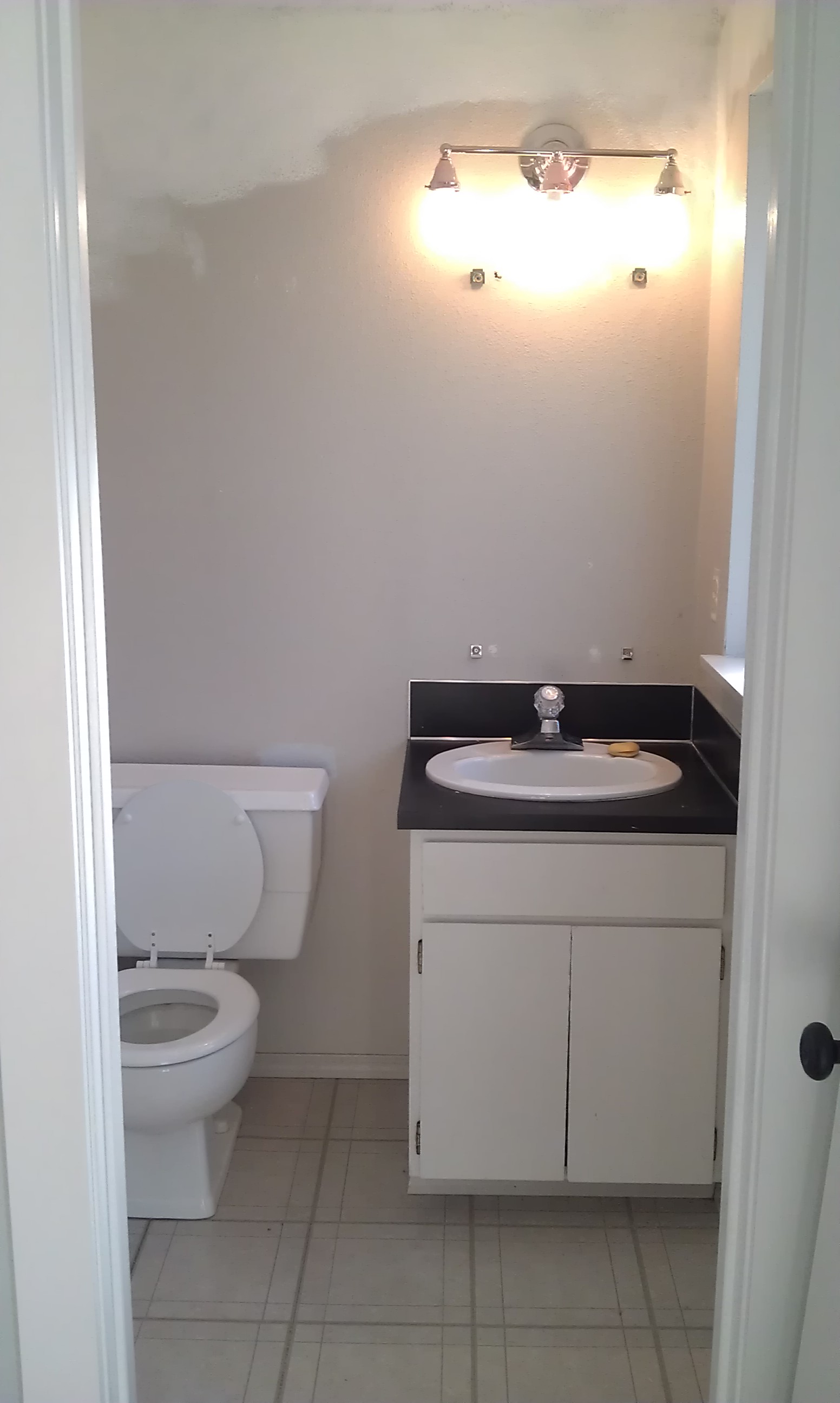 Gas station bathroom. That’s the only way I can describe what our half bath looked like. It is a tiny room, only 4 1/2 feet by 4 1/2 feet, but it was a whole lot of ugly. It was greige (shocker I know). The walls, floors, vanity and trim were all greige. There was a bit of color though. A purple popcorn ceiling added a bit of liveliness to the space and someone had painted a white border with wisteria around the top. The bathroom even came with some faux wisteria thumb tacked around the window.